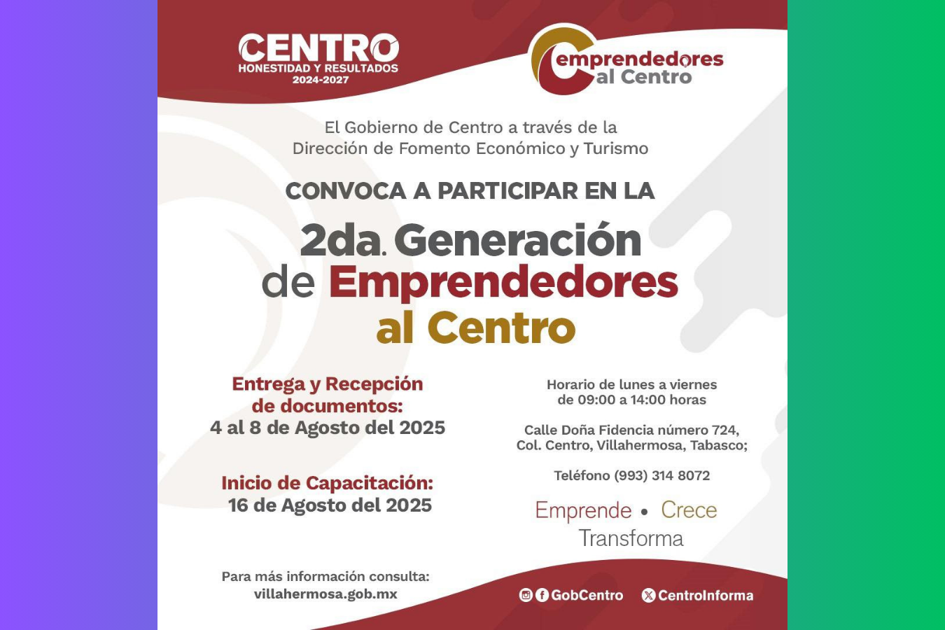 “Convocatoria: Segunda Generación de Emprendedores al Centro en Villahermosa”